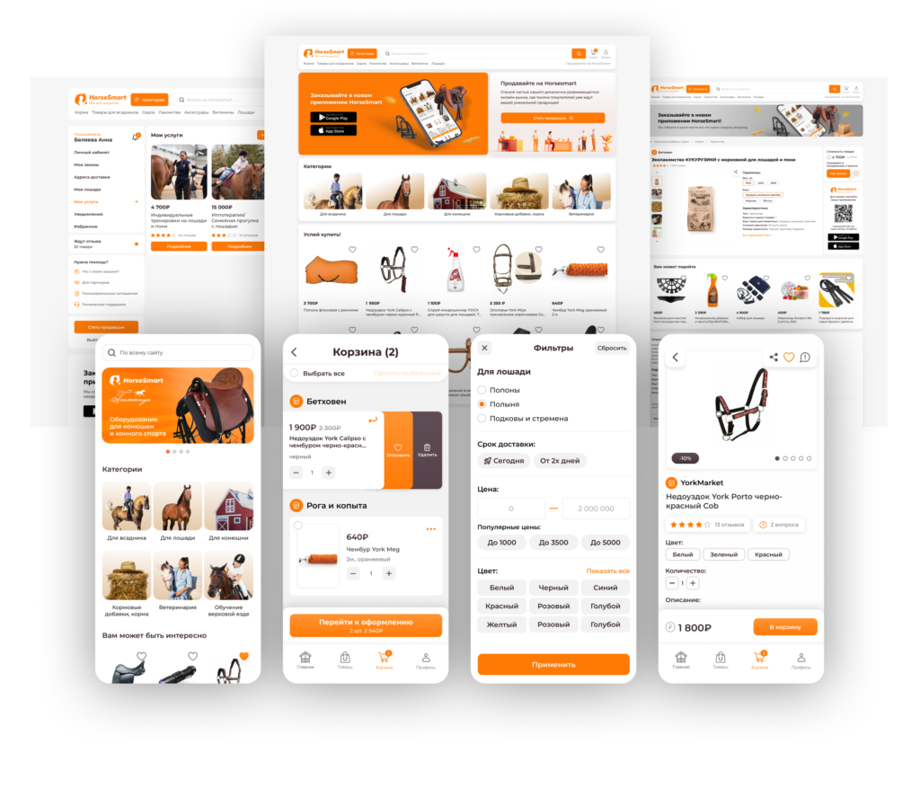 Проект представляет собой нишевую платформу для конной индустрии. Маркетплейс объединяет товары и услуги, связанные с конным спортом и содержанием лошадей. Фактически это специализированная площадка для конников, где представлены товары для ухода за лошадьми, экипировка, оборудование и сопутствующая продукция.